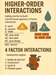 Higher order interactions are rare. Take making mortar to build a brick house requires a 3 factor interaction.